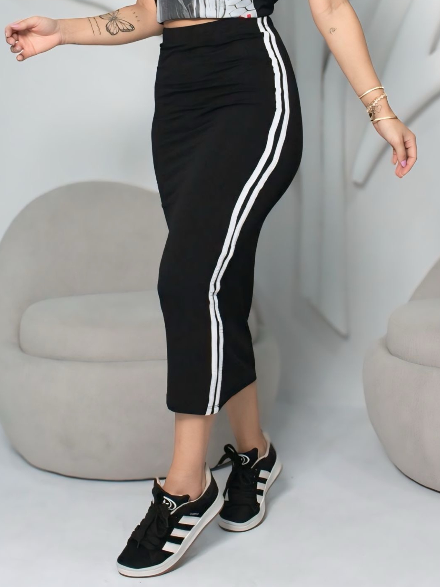 A Saia Paloma é uma peça moderna e versátil. Com um design listrado na lateral e comprimento midi que traz um toque contemporâneo, sua cintura com elástico valoriza a silhueta. Ideal para criar looks casuais ou mais sofisticados, essa saia é perfeita para qualquer ocasião.