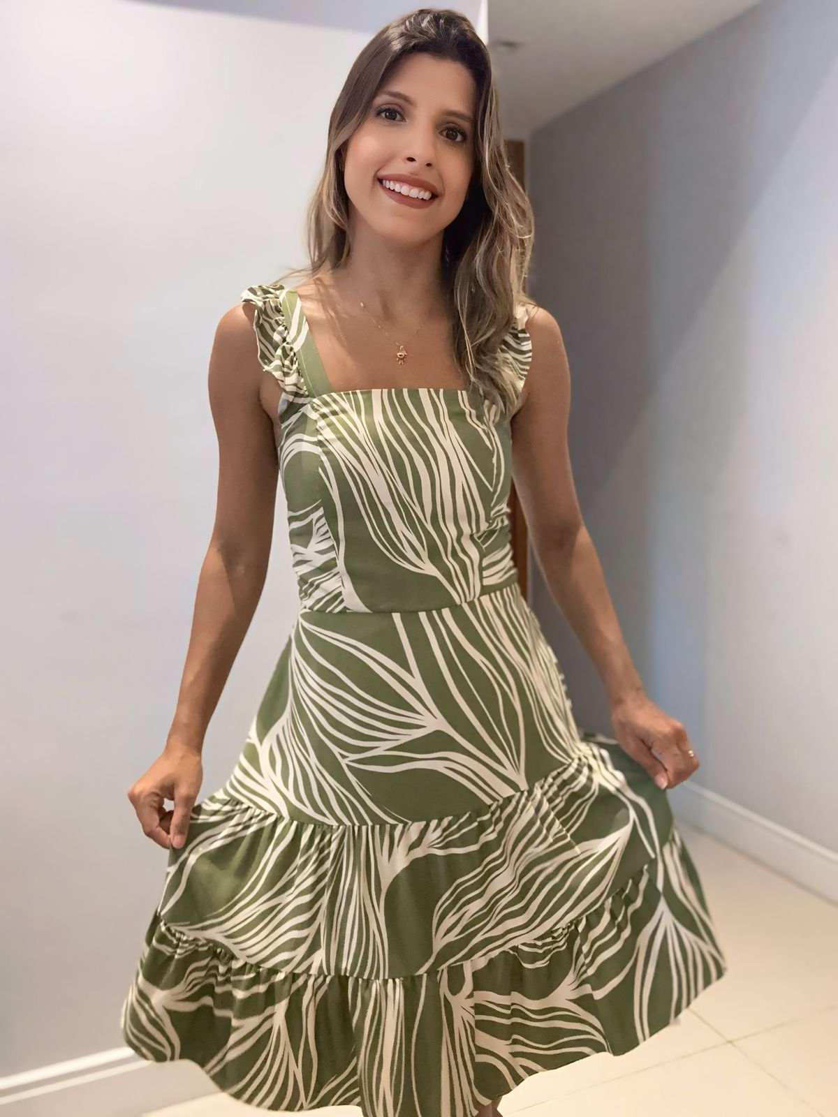 O Vestido Fátima é a opção ideal para os dias quentes de verão. Confeccionado em viscose leve e fluida, garante conforto e frescor. O modelo com alcinhas com babado na barra traz um toque delicado e feminino, enquanto o bojo, o forro e lástex nas costas proporciona suporte e modelagem. Sua estampa vibrante adiciona um charme extra, tornando o vestido perfeito para passeios, almoços ao ar livre ou encontros informais.